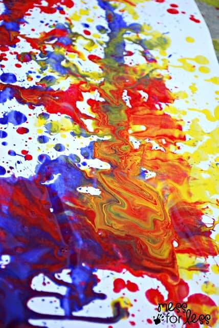 - Slowly lift the cup, and watch as the paint drips and blends together in beautiful swirls and patterns across the whole page! And, voila, a masterpiece!