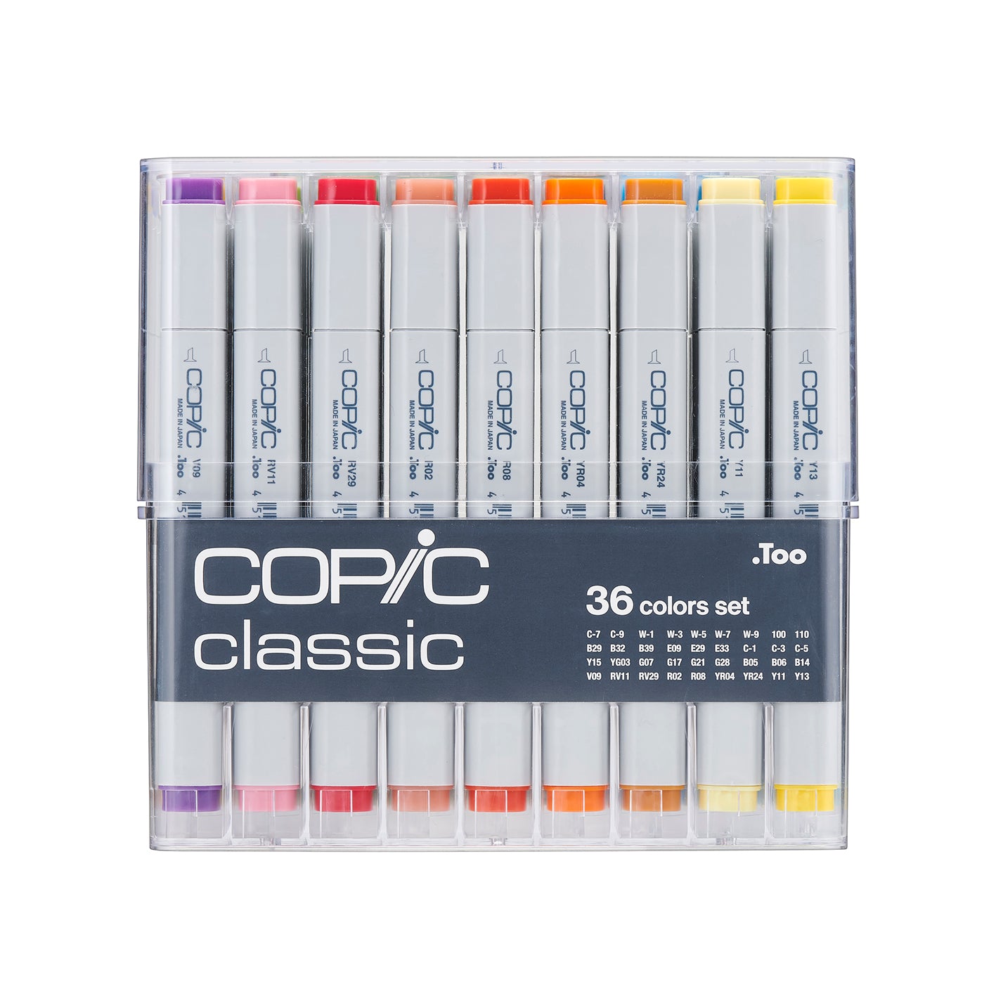 Copic Classic Markers feature a broad nib and fine nib with a square barrel. Copic Classic are the preffered illustrating tools used for decades by professionals around the world. With its outstanding performance and creative versatility, the COPIC Marker System provides the ultimate solution to design flexibility and artistic liberty. The square body profile is roll resistant on working surfaces. A solid polypropylene body is both smooth and comfortable, for a pure and controllable grip.Sets are a perfect way to begin your Copic colour collection or to expand on your current range. Sets come in a clear plastic case that also provides a great storage option.