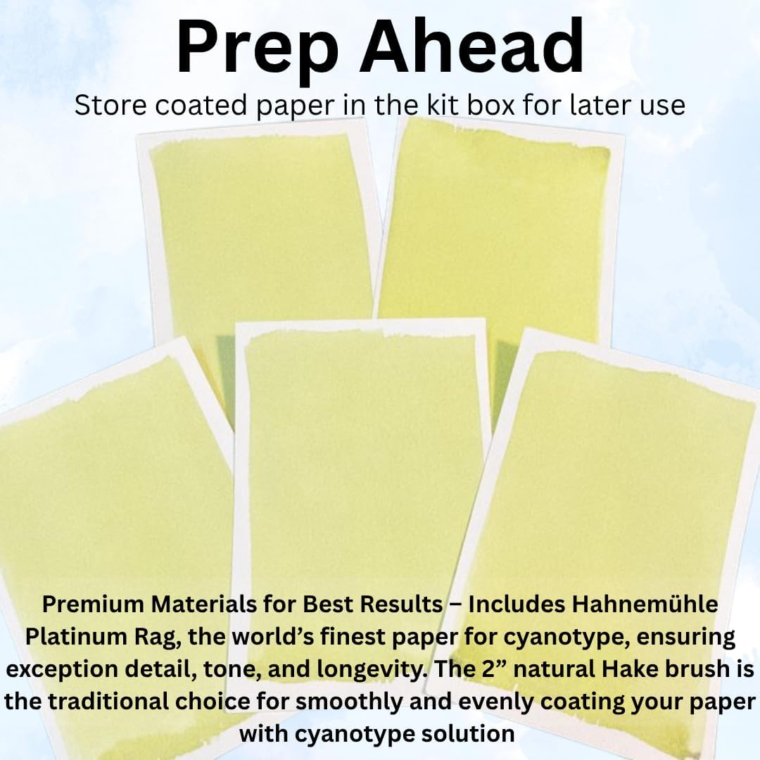 Jacquard’s Cyanotype Kit simplifies sun printing by providing all essential materials in one set. The premeasured chemistry is contained in lightproof black bottles—just add water to prepare Stock Solutions A and B, then combine them equally to form the cyanotype sensitizer. Using the included Hahnemühle Platinum Rag Fine Art Paper, apply the sensitizer and allow it to dry. Create images by exposing the paper to sunlight or UV light for 10-20 minutes with the glass printing frame, using objects or film negatives. After exposure, rinse the prints in cool water and let them air dry. The kit yields at least twelve prints sized 21.59 x 27.94 cm.