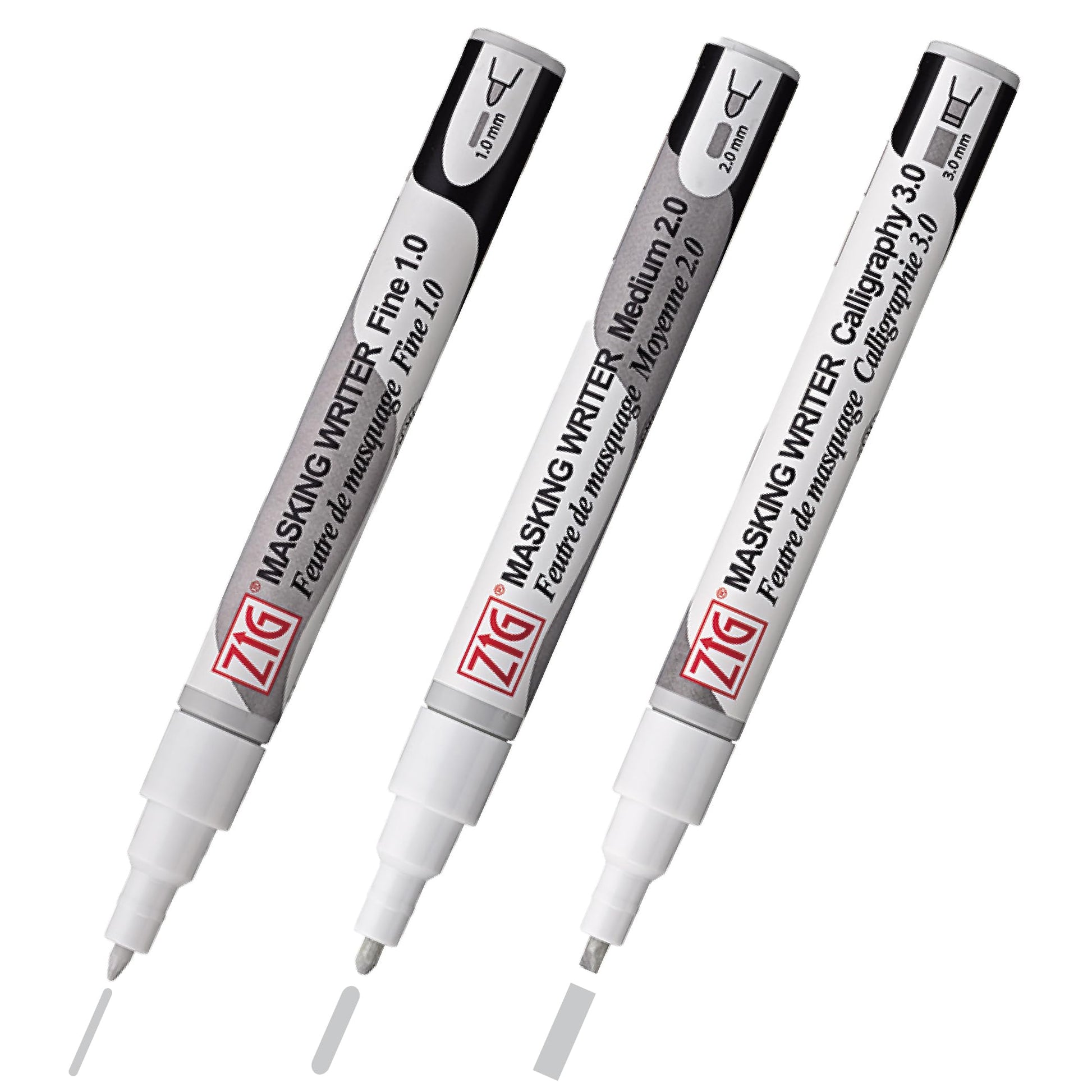 The Kuretake ZIG Masking Writer is a pen-style masking fluid that brings precision to watercolour and mixed media work. Available in three tip sizes—1mm for fine details, 2mm for general use, and 3mm for bold strokes—it allows you to preserve white space with control and elegance. Simply apply to your design, paint over it, then remove the dried masking to reveal crisp, clean edges. A sophisticated alternative to traditional brush-applied masking fluid, eliminating mess and uncertainty.