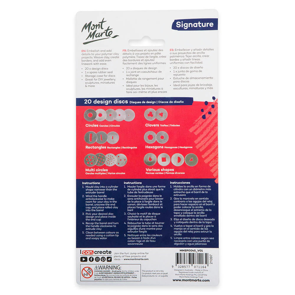 Enhance your creations with the Mont Marte Polymer Clay Extruder 22-piece set, designed to add intricate details and textures effortlessly. Featuring interchangeable discs, it allows you to craft various shapes, tubes, and patterns for your clay projects. Simply insert conditioned clay into the barrel, select a disc, and turn the handle to extrude your desired form. Perfect for crafting jewellery, sculptures, miniatures, and more, this durable extruder is constructed from anodised metal to ensure lasting performance through countless sculpting sessions.